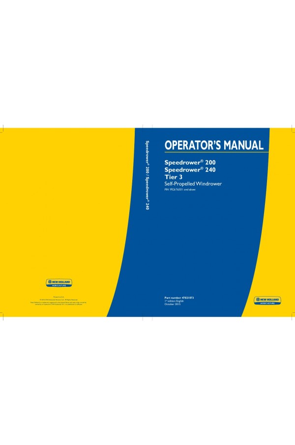 New Holland Speedrower 200, Speedrower 240 Hay Tools Operator`s Manual. New Holland Speedrower 200, 240 Tier 3 self-propelled windrower Operator`s Manual contains operating, maintenance, safety, and service information, PDF.
